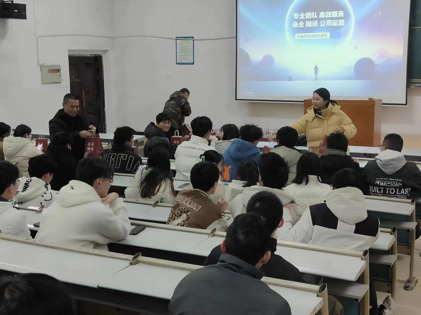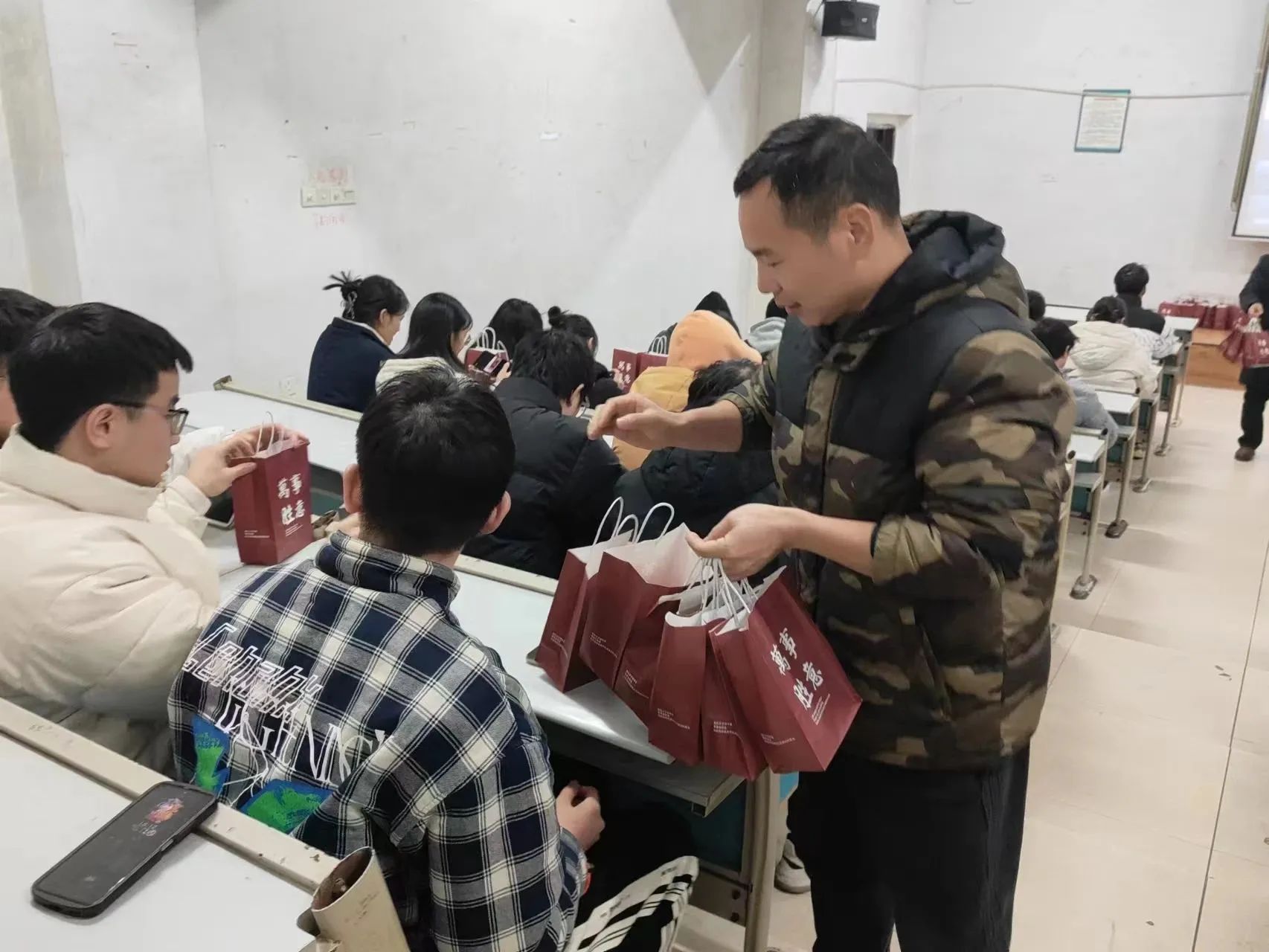 随后,胡文静、徐湛、吁唾一起为大家分发考研必胜大礼包。礼包中不仅有“‘橙’功上岸,心想事‘橙’”和能量加油包等暖心小美食,还有暖宝宝、祝福贺卡等暖心小物件,与此同时祝愿各位同学旗开得胜、上岸成功。