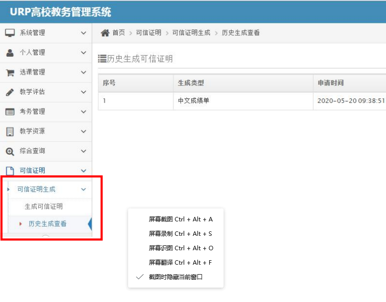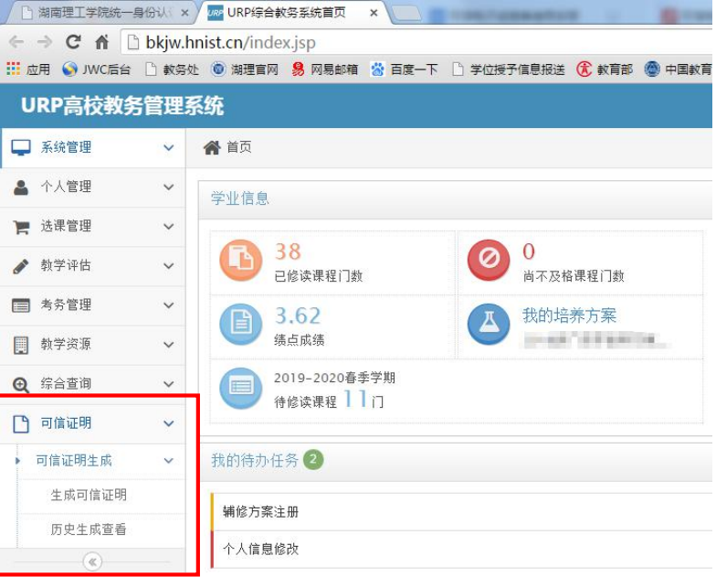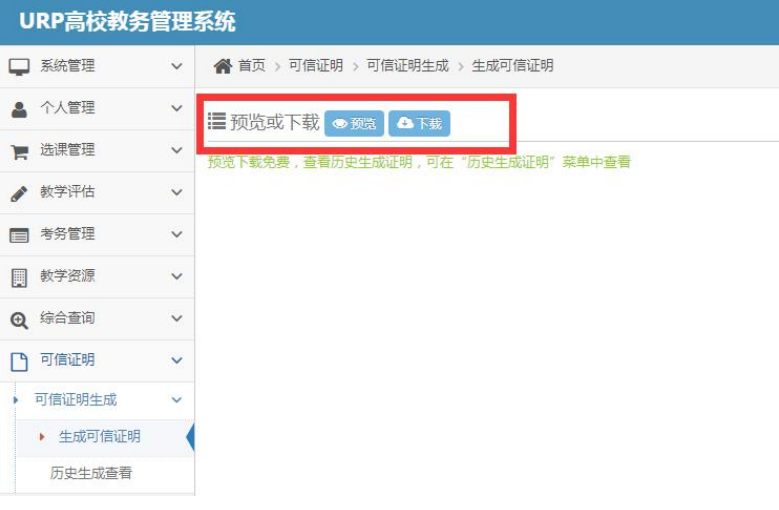 员工申请可信证明的操作流程 1 )通过 https://www.hnist.cn/ 意昂体育官网官网进入信息门户(右上角)。 2 )输入学号和密码登录。 3 )点击【员工教务管理系统】。 4 )点击【可信证明】→【可信证明生成】→【生成可信证明】 5 )在【生成可信证明】页面按需求选择证明类型,然后点击【生成并签章】。 6 )可信证明生成后,可选择【预览】进行浏览或点击【下载】保存。 7 )员工通过【历史生成查看】可看到自己所有的可信证明生成记录。