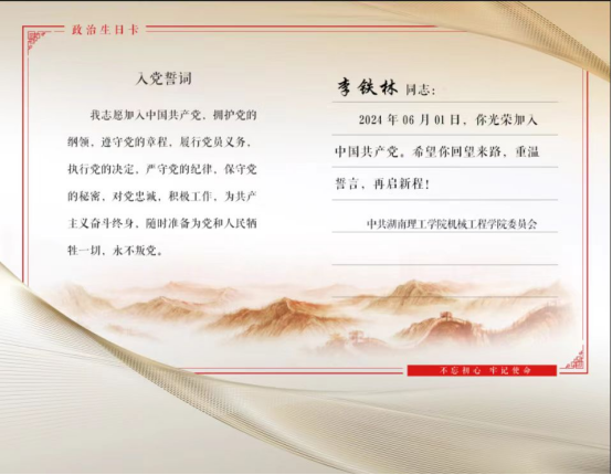 为让党员们时刻牢记“第一身份”,永葆对党的热爱与忠诚,进一步提升党员的政治意识和责任意识,积极发挥模范带头作用,6月28日,公司党委组织开展新党员入党宣誓暨“政治生日”活动。在宣读《批准中共预备党员通知书》、重温入党誓词后,党委书记徐丹与副书记李凯为这批新发展的党员送上寄托着公司党委希冀与关怀的“政治生日”卡。徐丹书记指出:“政治生日让我们牢记自己的第一个身份是党员,指导我们在伟大事业召唤下,不让方向失准,不让誓言蒙尘,不让信仰淡化,希望党员同志们在习近平新时代中国特色社会主义思想指引下奋力前行,让胸前的党徽熠熠生辉,永不褪色!”