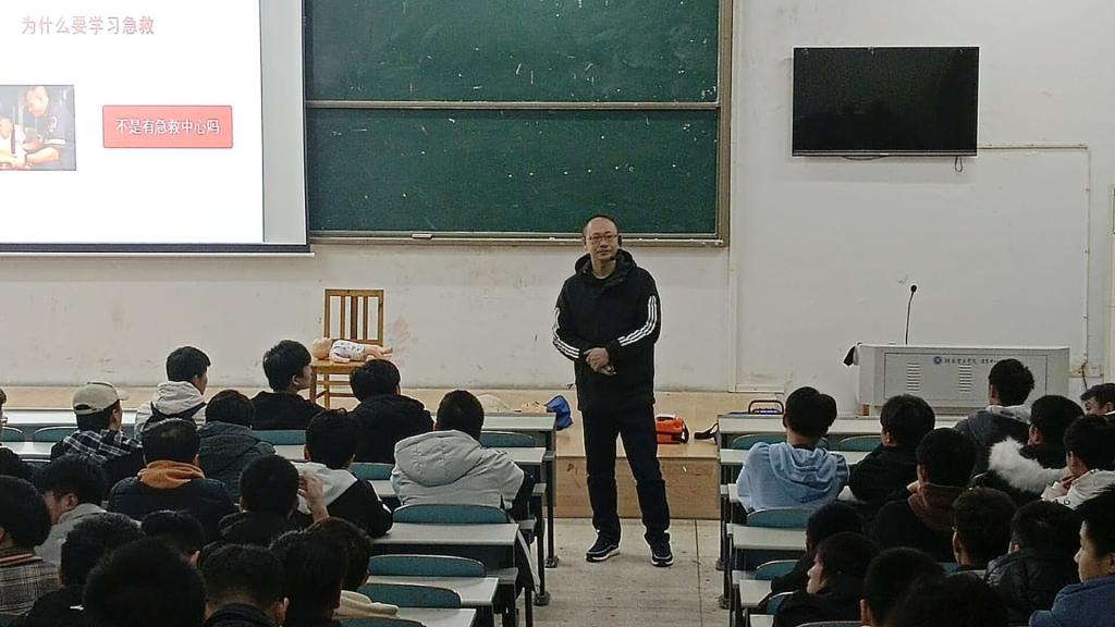 会议伊始,黄杨槟通过相关网络媒体视频引入主题,详实地列举了各类突发情况,强调了学习应急救护知识的必要性和重要性,同时以案例为引导,为同学们详细讲解了面对突发心脏骤停情况时的应对措施:要先从意识、呼吸、心跳判断患者是否需要进行心肺复苏,然后严格按照心外按压、开放气道、人工呼吸三个步骤次序进行心肺复苏流程。最后,他借助AED等医疗设备邀请同学上台进行手把手指导教学,让同学们可以在实操中掌握最科学的急救方法。