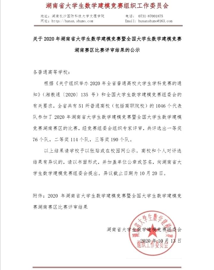 10月13日,2020年湖南省老员工数学建模竞赛暨全国老员工数学建模竞赛湖南赛区比赛结果揭晓,意昂体育组织的三支队伍从全省1046支队伍脱颖而出,全员获奖,其中一支队伍获得省一等奖,占全校省一等奖的50%,两支队伍获得省二等奖,占全校省二等奖的40%。